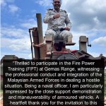 FPT 24 presented future capabilities of combat arms with the usage of drones for target acquisition and Battle Damage Assessment (BDA) whilst the Army Aviation shots FZ 70 mm rocket system from MD-530G helicopters. FPT 24 since its inception, has assisted the Course Participants (CP) of MCSCJ, providing them the visualisation of fire power prior embarking on the joint operational module during Semester 3. Brig Jen Zamsari bin Abu Hasan, Commandant of the Malaysian Armed Forces Staff College (MAFSC) conveyed his sincere appreciation and gratitude to the Chief of Army and particularly to all officers and personnel from 3 CAD who were involved in FPT 24.